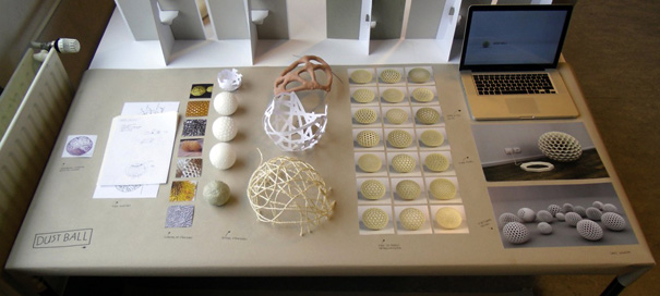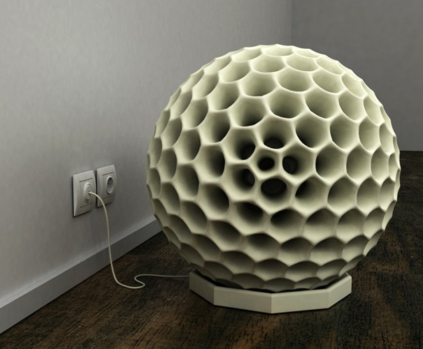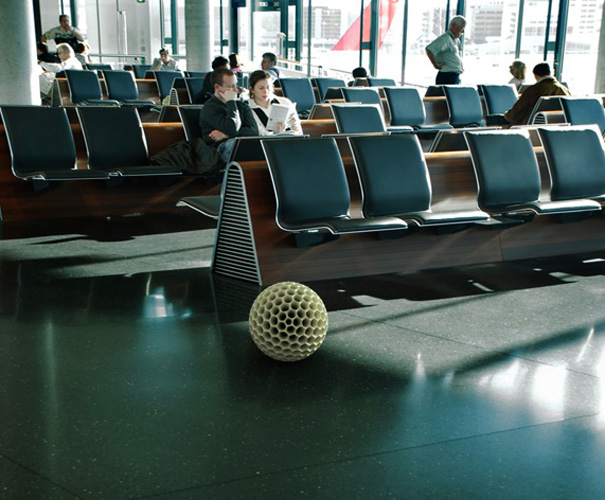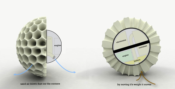 A giant dust ball that cleans dust balls? The idea is too weird and too good. I’m sold. The motor inside doubles as the dust bin and drives the unit by rotating on 2 axes to generate enough force to move. When full, it automatically returns to its starting point and glows.