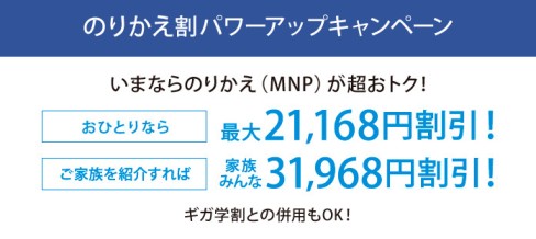 ソフトバンクにはのりかえ割パワーアップキャンペーンが行政指導の対象になりました。MNP転入で個人の場合21168円、家族だと3万1968円割引内容でほとんどの機種が0円以下になってしまうことが問題視されました。