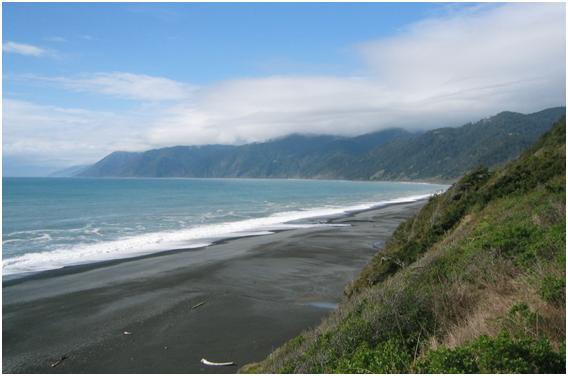 On the Coast of California you will also be greeted by a beach named Black Sand Beach. This beach brings about an extremely dramatic scene, with beautiful water, sand, and peaks all around it.