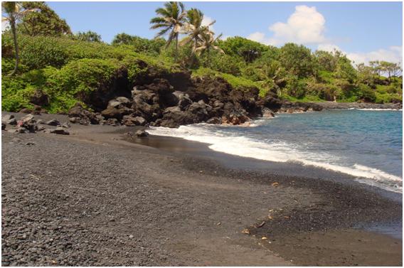 Honokalani Black Sand Beach is located in the Wainapanapa State Park. The beach offers lava pebbles that are smooth and small. Around the beach you will find lava cliffs. You will also find sea caves, a sea arch, as well as seaside lava tubes.