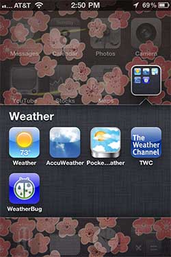 Organizing your apps into folders is really easy to do. Just hold your finger down on an icon and then drag it on top of another icon to create a new folder with those two icons inside it. Each folder can have a maximum of 12 icons. The folder will be named automatically depending on the category of the programs, but you can rename it to whatever you wish.