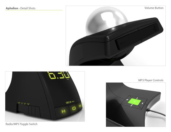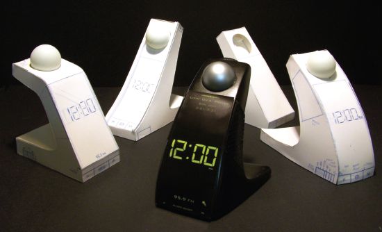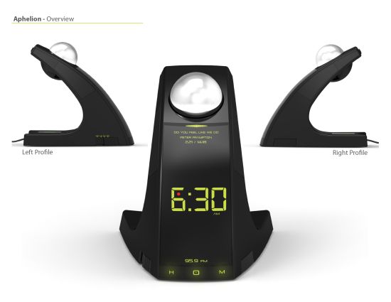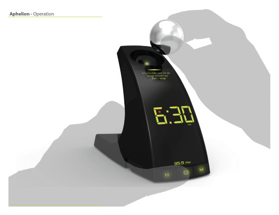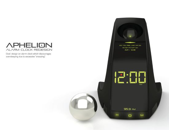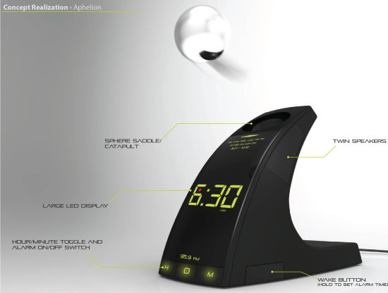 I adore this concept design. It's basically an alarm clock which flings a ball at your face before going off. In order to make the noise stop, you have to find the ball and put it back where it belongs.
