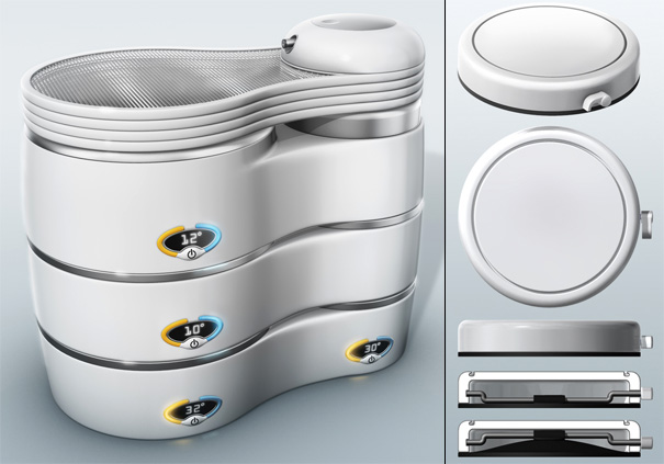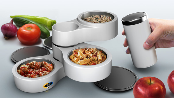 When the lunch box is closed, the compartments are connected to an electrical circuit through three lids for heating and cooling at the same time or separately, depending on the user’s wishes. Once opened, the electrical circuit is broken allowing you to take out the compartments individually and eat! Every pan has its own display through which you can control the heating or cooling your food.
