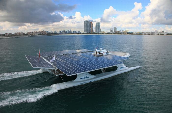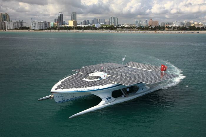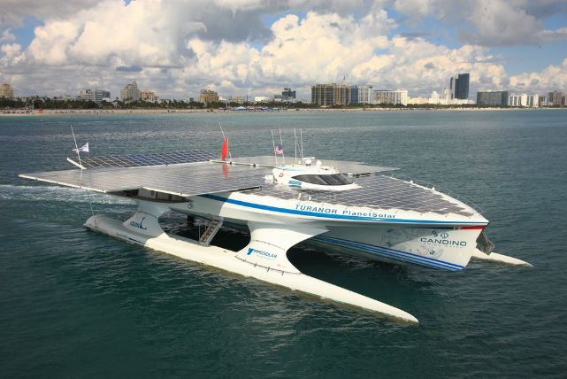 The PlanetSolar boat is a multihull white catamaran topped by about 5,300 square feet of photovoltaic solar panels comprising 38,000 of SunPower's solar cells, the efficiency of which is an impressive 22 percent.