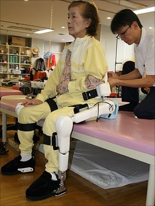 Her left arm is in a sling, her left leg propped up on a footrest. Mrs Nishi has been chosen to try out a new device developed to help people like her walk again. It is a pair of robotic legs. A physiotherapist helps strap her in. From a hip joint there are struts running down the outside of her thighs, to another joint level with her knees. The metal and plastic rods also run down her calves to special shoes she can put her feet in. The two limbs are joined together by a wide belt that goes round the back of Mrs Nishi's hips.