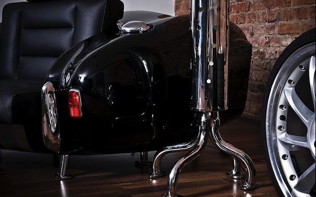 Take a charm of car in your living room using car living room. This room is made by Polish designers using American classic car parts from the 60’s. This room includes: sofa, armchair, a coffee table office desk and standing lamp. All the listed things are made from original car parts.