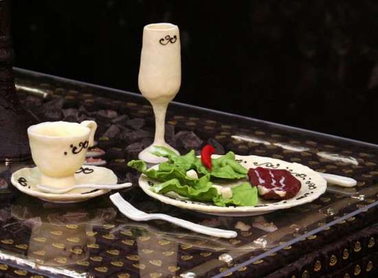 A shopping mall in Vilnius , Lithuania , decided to surprise its shoppers on Valentine’s Day by offering them a unique visual treat - a room made entirely of dark and white chocolate. The 17-square-metre (183-square-foot) room is made of chocolate from floor to ceiling, and also contains chocolate furniture and interior decorations such as candlesticks, pictures and books.