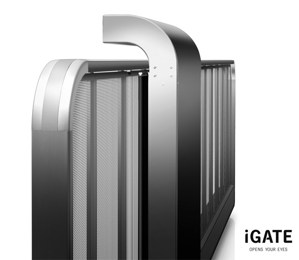 iGATE targets premium architectural environments and sets the new standard in design, functionality and security. The soft and welcoming design of the frame with it’s integrated safety lights gives the visitor of any headquarters the right impression immediately. iGATE also allows free choice of colour of the frame and the filling, illuminated by colour changing LED’s, there is a large choice of frame fillings for the architect, from conventional beams to artistic patterns in perforated plating, adapting to any kind of architecture.