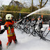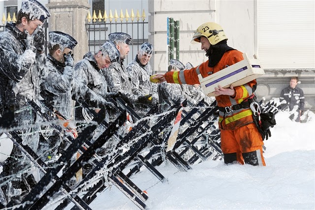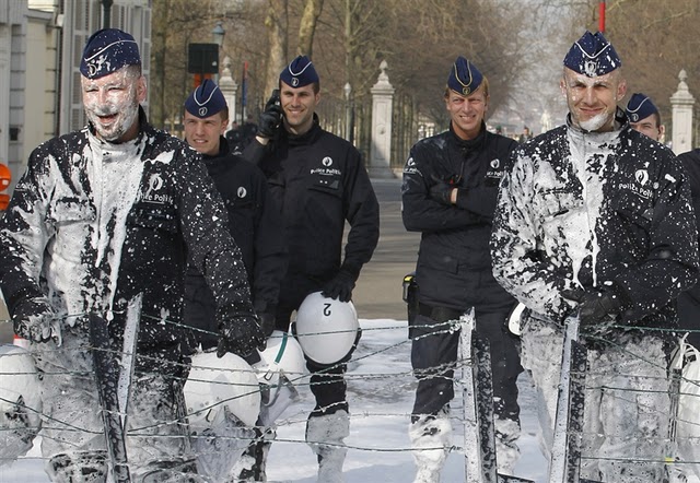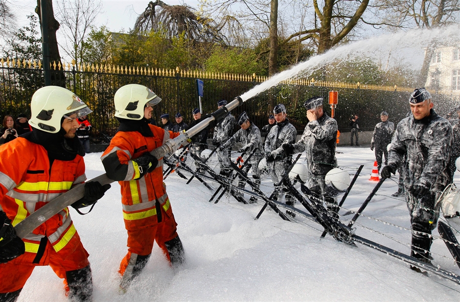 Firefighters spray foam over police officers during a protest at the Minister-President's office in Brussels, Belgium on March 25. Members of Brussels' fire brigade are demanding clearer rules with regards to nominations and promotions.