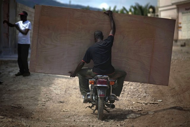 A man carries wooden boards on a motorcycle in Haiti.