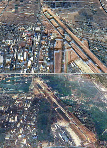 Japan's Sendai Airport was nearly destroyed by the 8.9 magnitude earthquake which triggered the tsunami. March 2011 photos (bottom) show that the runway and other airport infrastructure have been completely washed out.
