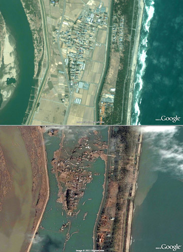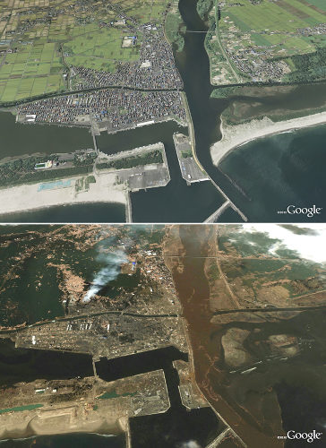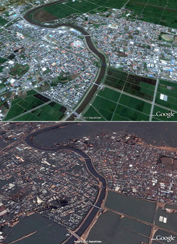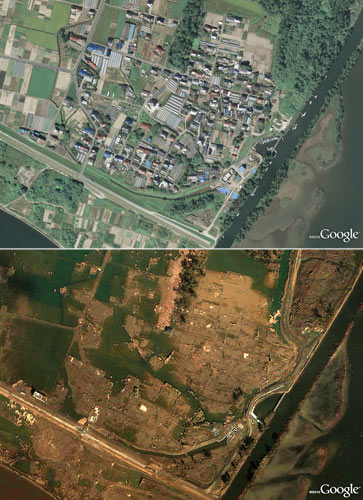 Much of Kashima, part of Minamisoma, Japan, is now under water, contrasting with the 2003 image shown above it.
