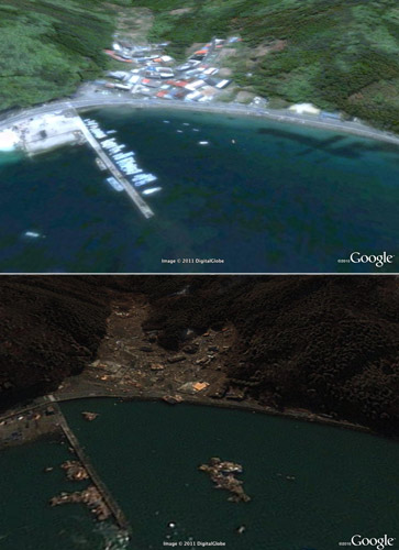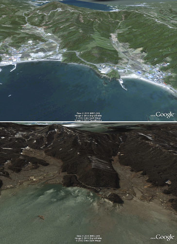 The Oshika Peninsula on the shoreline of Iigohama was once blue, green, and budding with life. Now (bottom) the area has been devastated by the tsunami floods.