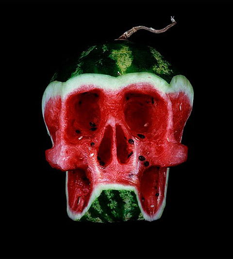 Russian artist Dimitri Tsykalov uses fruits to curve out impressive and creepy looking skulls. Have a look.