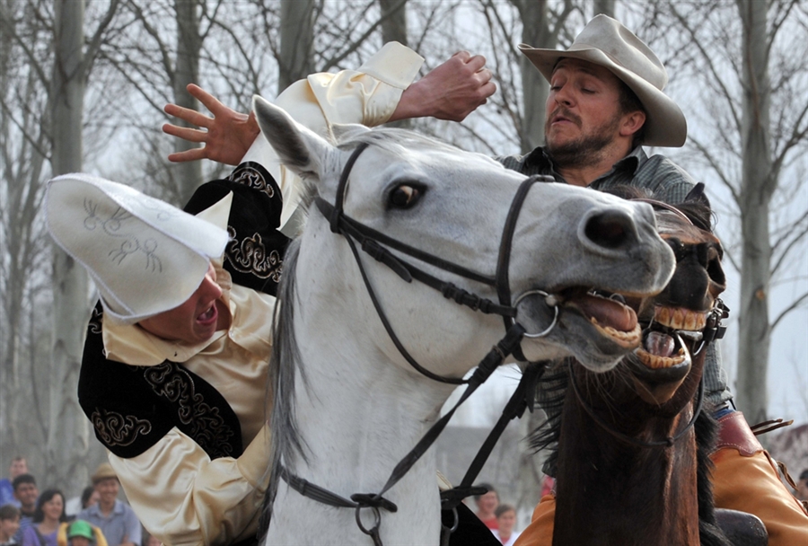 Mounted men try to take each others hats during an equestrian holiday in Bishkek, Kyrgyzstan, on April 9.