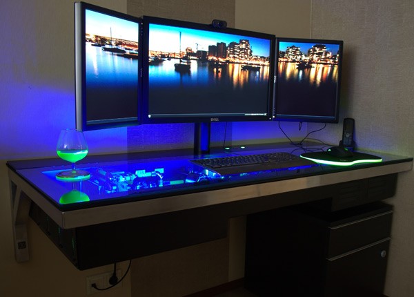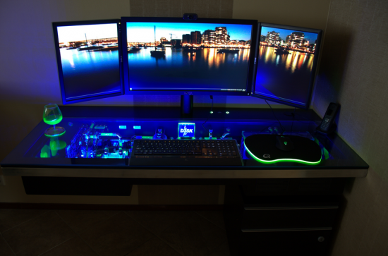 The machine, dubbed L3P Desk has a 4.5 Ghz Intel Core i7-980X, two ASUS GeForce GTX 580 cards, 12 TB of storage, and a 1,500 watt power supply, all built into a transparent desktop enclosure. L3P Desk also has a 6GB of Corsair Dominator GT DDR3 RAM, an Asus Rampage III Extreme motherboard and more water-cooling hardware. The three-piece monitor setup is also a custom arrangement, with a 27-inch U2711 IPS panel being flanked by two 17-inchers.