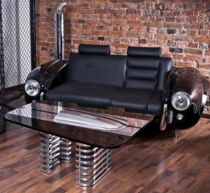 Take a charm of car in your living room using car living room. This room is made by Polish designers using American classic car parts from the 60’s. This room includes: sofa, armchair, a coffee table office desk and standing lamp. All the listed things are made from original car parts.