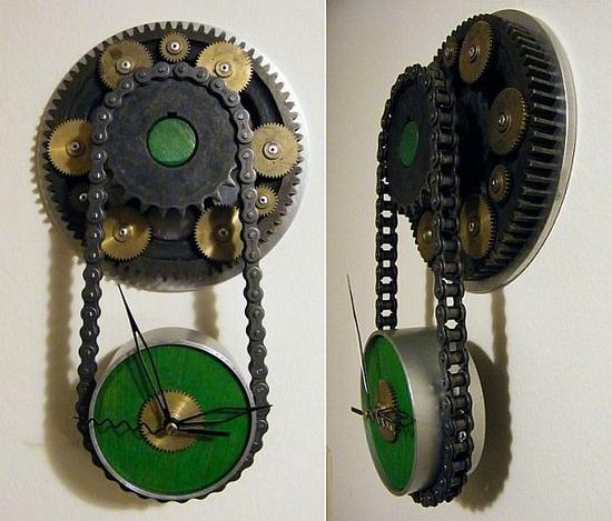 This clock painted in green has birch plywood facade and an air cylinder tubing body from PHDinc. Weighing 9lbs and measuring 8″ is its main clock body with the gears. When the whole piece is suspended, it measures 14″ while sticks out 3 1/2″ from the wall. Since it weighs a little on the heavier side, make doubly sure that the screw is strong enough to take its heaviness.