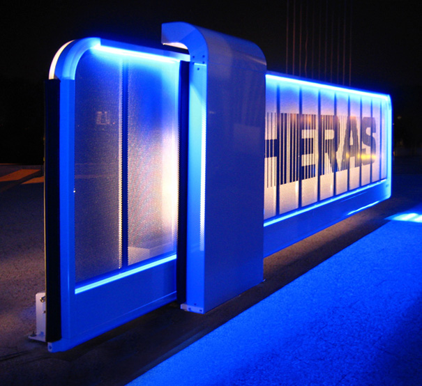 iGATE targets premium architectural environments and sets the new standard in design, functionality and security. The soft and welcoming design of the frame with it’s integrated safety lights gives the visitor of any headquarters the right impression immediately. iGATE also allows free choice of colour of the frame and the filling, illuminated by colour changing LED’s, there is a large choice of frame fillings for the architect, from conventional beams to artistic patterns in perforated plating, adapting to any kind of architecture.