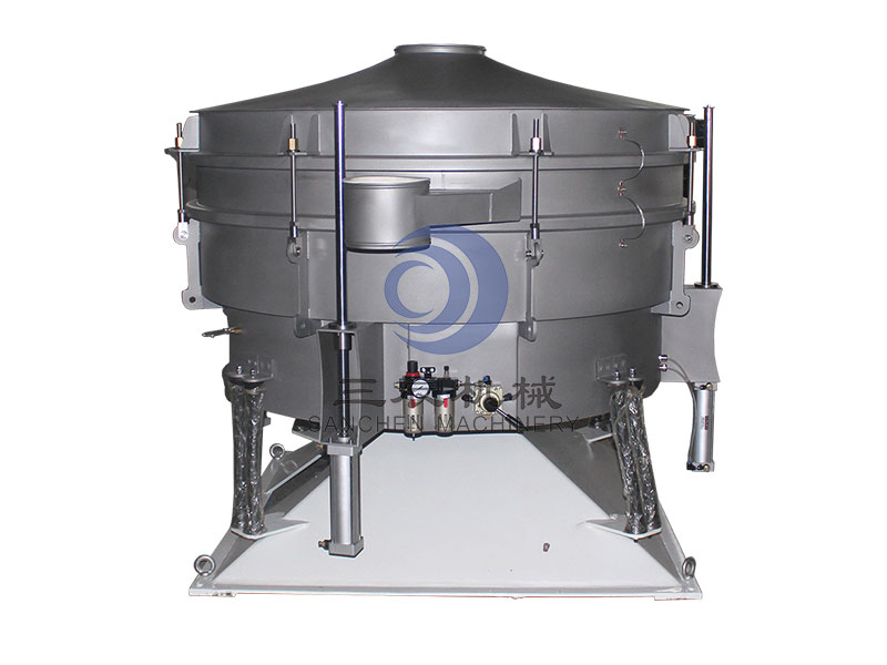 从运行轨迹来看,摇摆筛是一种非线性惯性振动筛,基本的回转运转与人工筛分相类似。偏心率从25到40mm可调,低速V型皮带驱动从120到360rpm可调。每一种产品的停留时间可以通过摇摆筛的径向与切角朝驱动轴线方向进行调整。因此建立水平与抛掷三维翻滚运动。物料从中心到外缘在整个筛面上均匀分散,从而以螺旋运动往轴向传播。细小颗粒从而完成了整个筛分过程。水平与垂直加速度随着粒子的运动而增加,接近筛孔尺寸的颗粒随之成功分离;较大颗粒被运到出口处,出口处有一个可调节的导向装置控制流量,该导向装置是控制物料停留时间的另一个因素。